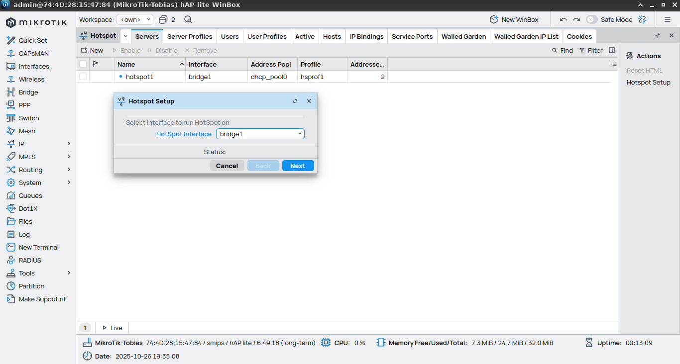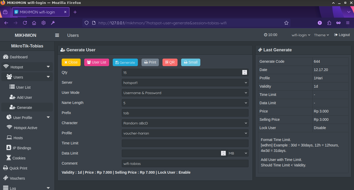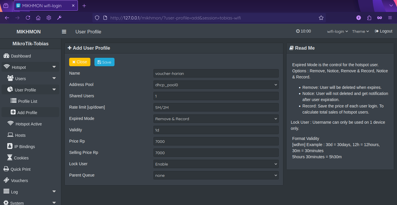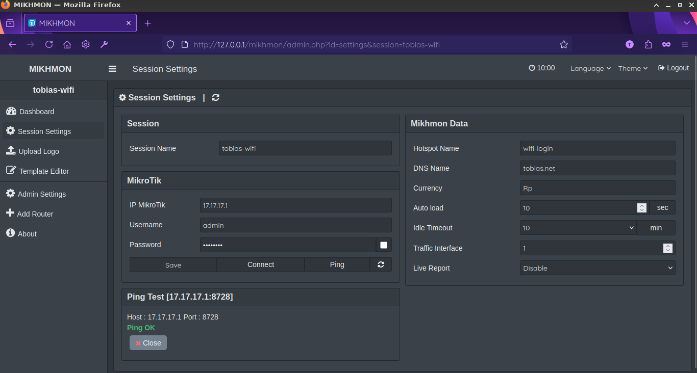 Langkah selanjutnya adalah menambahkan session setting pada mikhmon. ip mikrotik (isi dengan ip bridge), username && pasword (isi dengan username && password yang sama dengan winbox), dns name (isi persis yang dibuat saat hotspot setup) -> selanjutnya save -> tes ping (pastikan hasilnya ok) -> connect :
